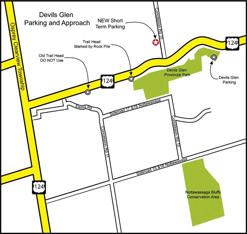 Alternatively, climbers can park in Devils Glen Provincial Park. Parking is currently no charge. Walk back up the shoulder of HWY 124 to the trail head.